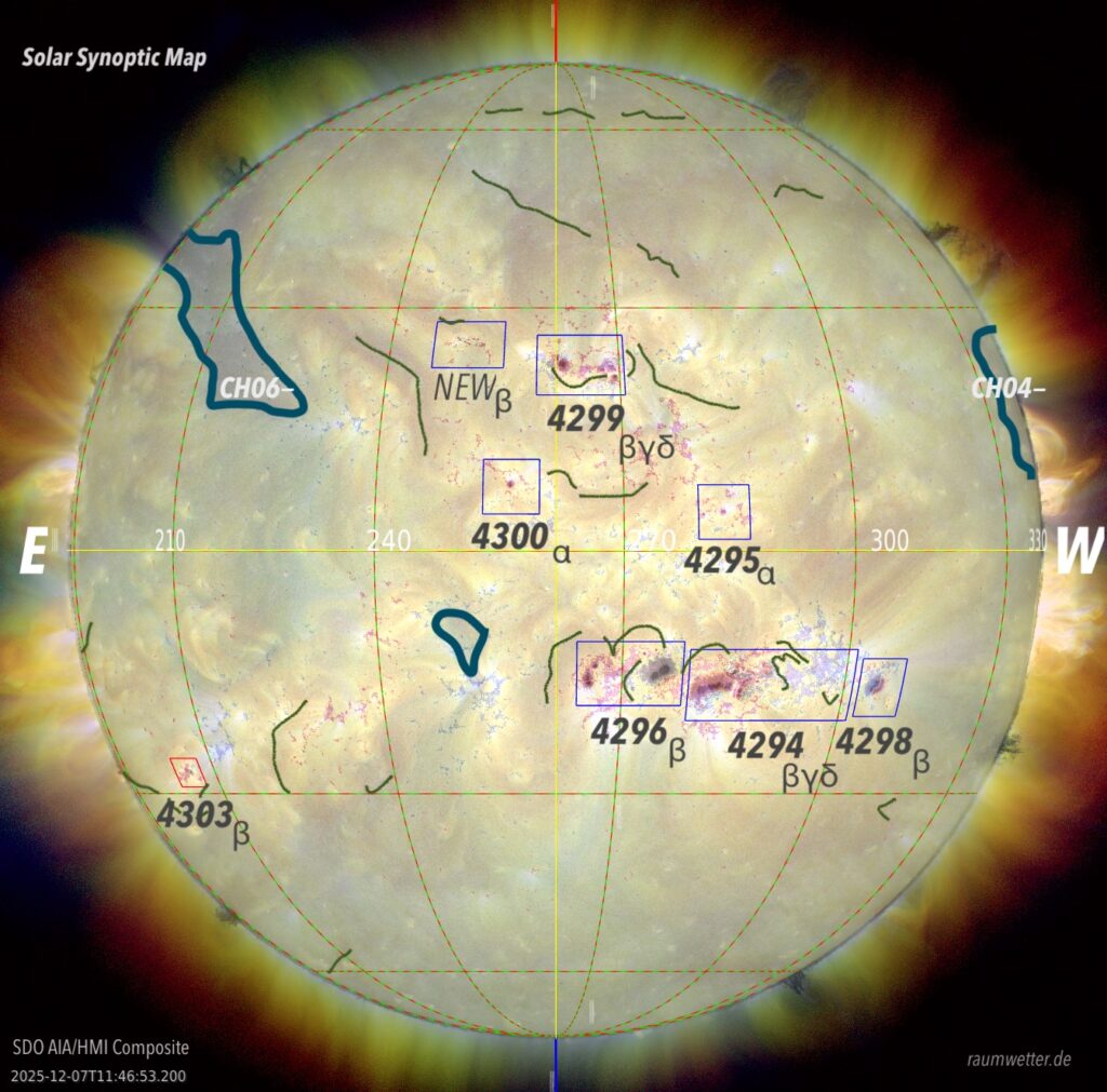 Region 4299 produzierte am 6.12. um 18:58z-19:36z einen M1.1 Flare, um 20:29z-20:49z einen M8.1-Flare mit 10cm-Radio-Burst, Type II Radio Burst (1143 km /s) sowie einen Type IV Radio Burst, was auf einen kräftigen CME mit Shockwelle hinweist. Energetische Protonen und Elektronen wurden freigesetzt, allerdings unter der Warnschelle für Strahlungssturm – da wir magnetisch mit der Region nicht gut gekoppelt sind (sondern noch mit CH04 am Westrand).